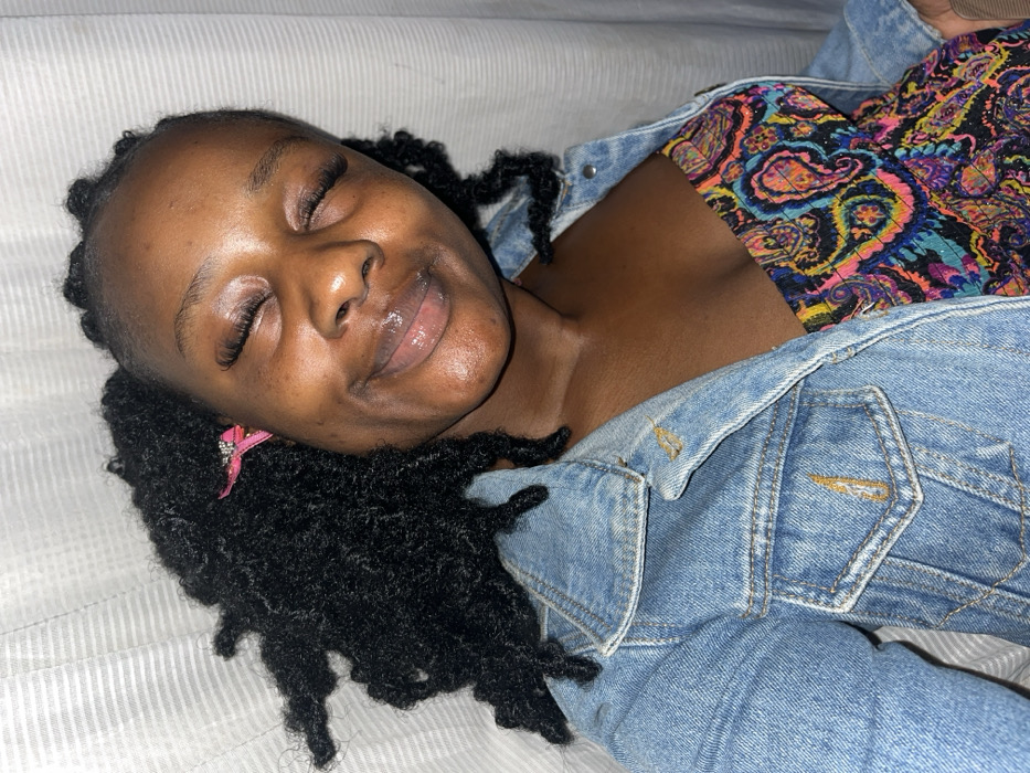 A young woman reclines with her eyes closed and a gentle smile on her face. She has dark skin, glossy lips, and full eyelash extensions. Her dark, curly hair rests against the light gray surface beneath her. She wears a colorful, patterned top and a light-wash denim jacket. The lighting appears soft, casting a subtle glow on her skin.