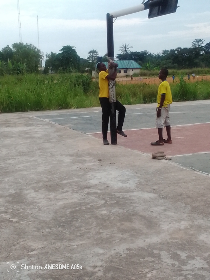 The image depicts an outdoor scene on a concrete basketball court in Egbagu, Nigeria, under an overcast sky