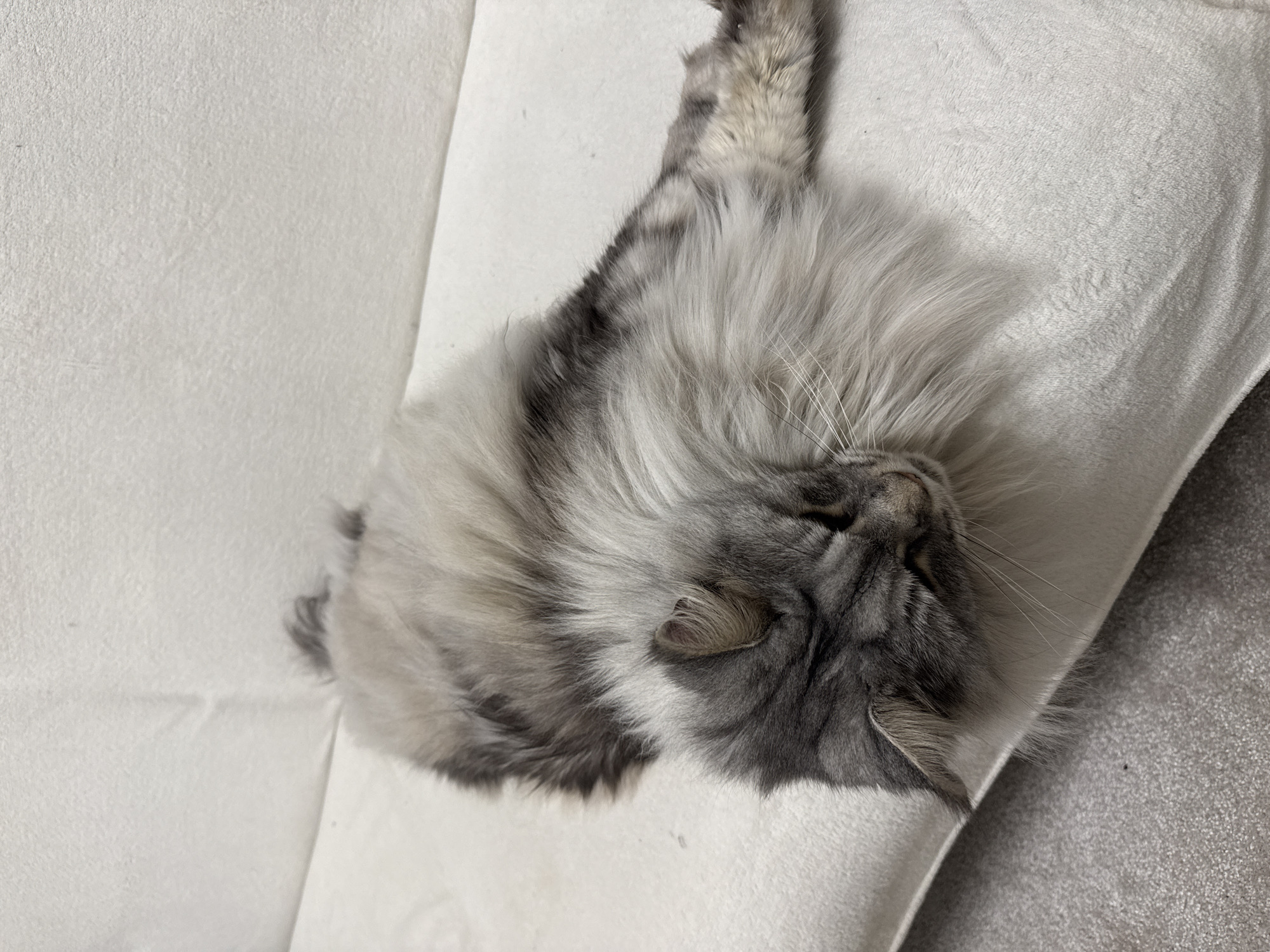 A gray and white long-haired cat is sleeping upside down on a white cushion or couch