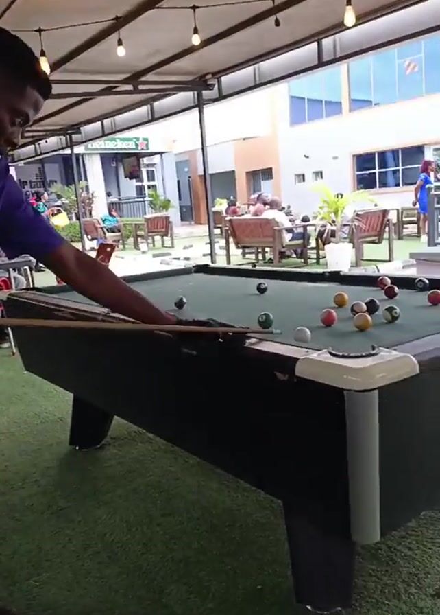 A young man in a purple shirt and black pants is playing pool under a covered patio. He is barefoot and wears a black glove on his left hand. He takes a shot, then surveys the table. Several other people are sitting at tables in the background, watching him play. The patio has a green artificial turf floor and string lights hanging from the roof. There are buildings visible beyond the patio.