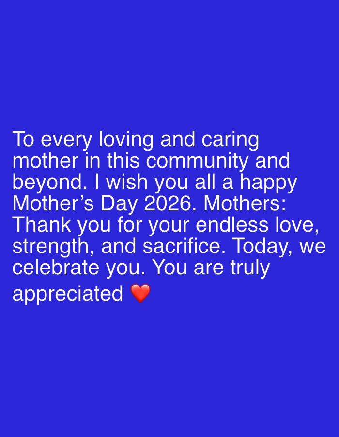 The image displays a digital graphic, contextually placed in Ado, Nigeria, featuring white sans-serif text against a solid dark blue background. The text, centered on the screen, states: 'To every loving and caring mother in this community and beyond. I wish you all a happy Mother's Day 2026. Mothers: Thank you for your endless love, strength, and sacrifice. Today, we celebrate you. You are truly appreciated ❤️'. A red heart emoji is present at the end of the message. The content is purely textual and illustrative; no physical scene, individuals, or dynamic interactions are depicted.
