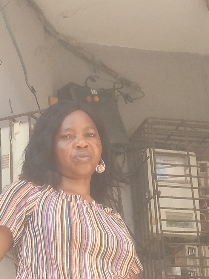 An adult female is depicted in a medium shot within what appears to be an indoor or covered outdoor area in Iranla, Nigeria