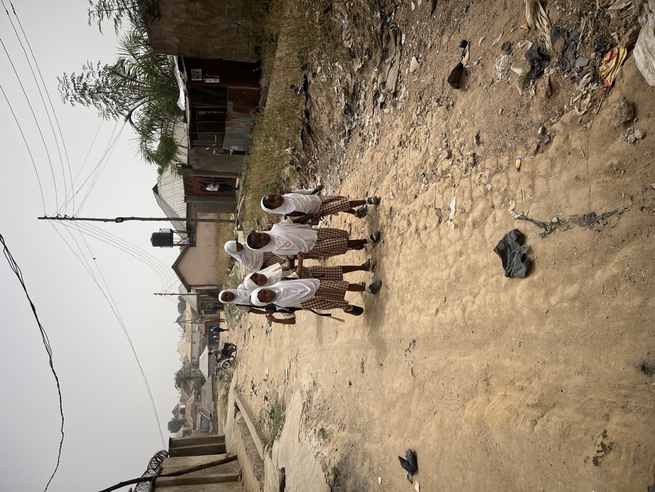 - "Six young females, likely school children, walk in a group from right to left on an unpaved dirt road in a residential area of Ado, Nigeria" by FM-x1vHr2, licensed under CC BY 4.0