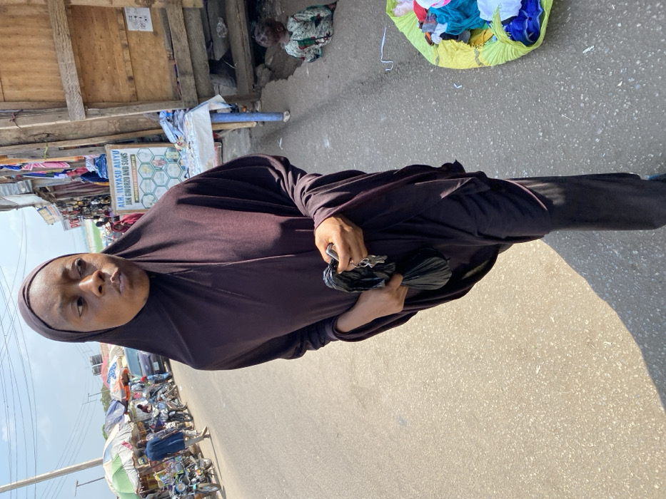 - "An adult female, wearing a dark brown hijab covering her head and body, along with matching trousers, is captured walking on an asphalt road surface in a bustling market area of Lokoja, Nigeria" by FM-B1vnC2, licensed under CC BY 4.0