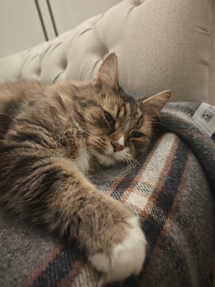 - "A domestic long-haired tabby cat, displaying brown and black striped fur with white markings on its chest, nose, and front left paw, is positioned resting on a patterned plaid blanket" by FM-XRse82, licensed under CC BY 4.0