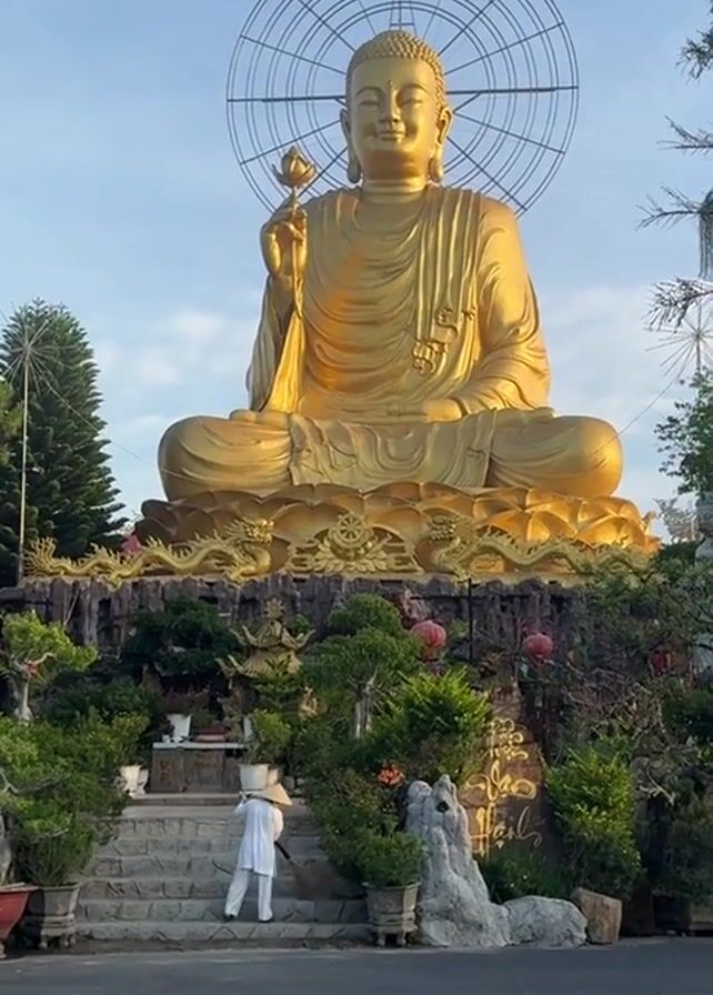 Here's a concise description of the video: The video shows a large, golden Buddha statue in a seated position. The statue is surrounded by lush greenery and ornate decorations. A person wearing a traditional white Vietnamese outfit and a conical hat sweeps the steps leading up to the statue's base. The sky is blue, and the scene appears peaceful. A circular, cage-like structure rests behind the Buddha's head.