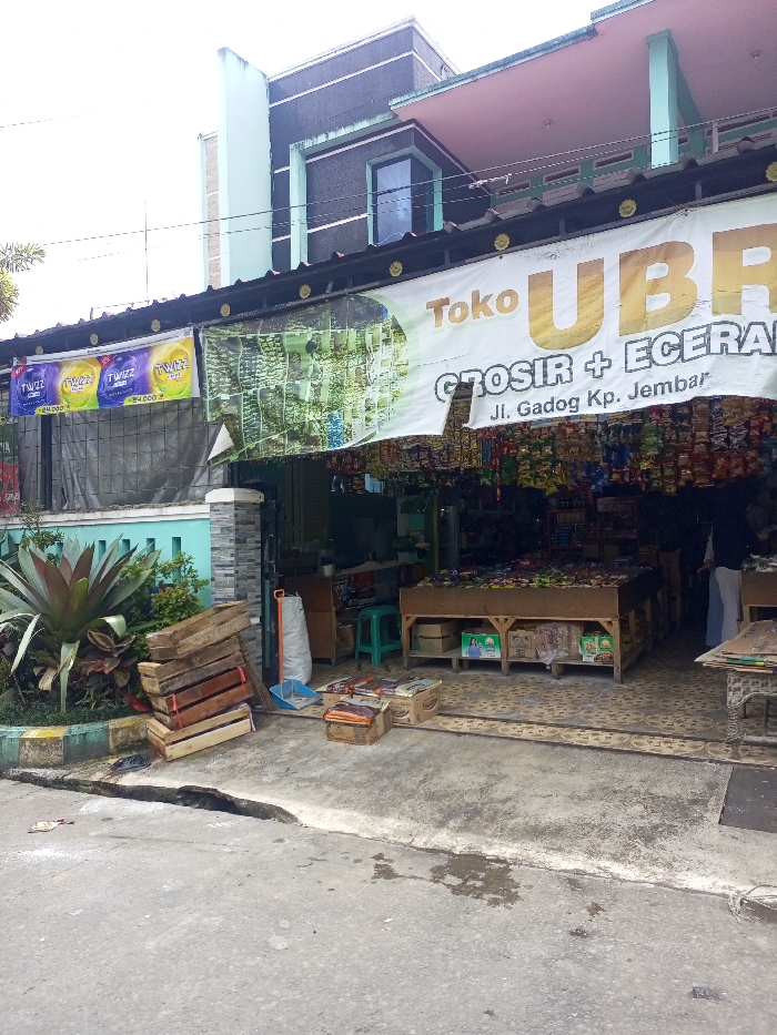 The scene depicts an open-front retail establishment, purportedly located in Meyong, India. A large white banner above the entrance identifies the business as "Toko UBR, Grosir + Eceran" (Shop UBR, Wholesale + Retail) and indicates an address of "Jl. Gadog Kp. Jembar." Smaller banners to the left advertise "TWIZZ PURE" products for "Rp. 24.000," which denotes Indonesian Rupiah. The two-story building features a dark grey upper level with a single window and a pink roof overhang, while the ground level, painted light blue, accommodates the shop. Inside the shop, a dense array of individually packaged snack items hangs from the ceiling across the entire width of the entrance. Multiple wooden display tables are visible, laden with various packaged products, appearing to be groceries or household items, with cardboard boxes stored underneath. A person, partially obscured and facing away, wearing a dark top and light-colored bottoms, is standing inside the shop on the right side. Outside, on the concrete pavement to the left of the entrance, a stack of six wooden crates, a white sack, and multiple boxes of packaged goods are present. A light blue dustpan and a broom handle lean against the wall. Adjacent to these items is a raised garden bed containing a prominent succulent plant and other foliage. The concrete pavement transitions into a darker, asphalt-like road surface, across which a distinct crack is visible. The lighting suggests an outdoor daytime setting.