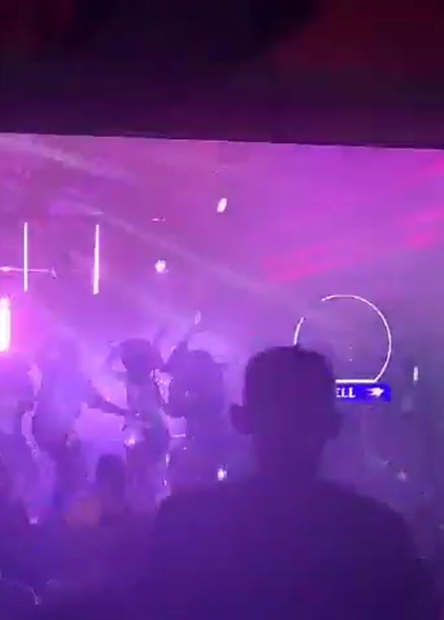 A crowded venue shows a live band performing on stage, projected on a large screen. Patrons are standing, watching and enjoying the show. A person in the foreground raises their fist in the air, as if cheering. The venue has green accents and a disco ball. Lighting effects are prominent throughout the scene. There are additional monitors visible on the right side of the screen.