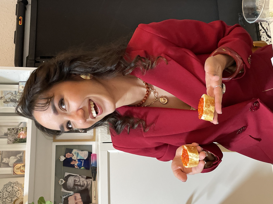A smiling woman with dark hair and gold earrings wears a red blazer and holds two small canapés topped with red caviar. She also wears a gold necklace with red stones and a gold pendant. The background includes framed photos on a white shelf and a dark-colored appliance above. The woman’s expression and attire suggest a celebratory or elegant occasion.
