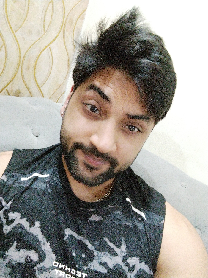 A male individual is depicted in a close-up indoor portrait. He presents as a young to middle-aged adult with dark hair styled with upward volume, a neatly trimmed dark beard, and a mustache. His eyes are dark, and his complexion is fair to medium. A small silver stud is visible in his left earlobe. He is wearing a dark-colored, sleeveless shirt with a light-colored abstract or camouflage pattern. Inverted text on the shirt partially reads "TECHNO SPORT". A thin metallic chain is visible around his neck. The subject maintains eye contact with the camera and displays a neutral to slightly smiling expression. The background on the left features a wall covered with light-colored wallpaper displaying a wavy, organic pattern. To the right and behind the subject, a segment of light gray, tufted upholstered furniture, possibly a sofa or armchair, is visible. The lighting is even and bright. The specific location within Bidhannagar, India, is not discernible from the provided image.