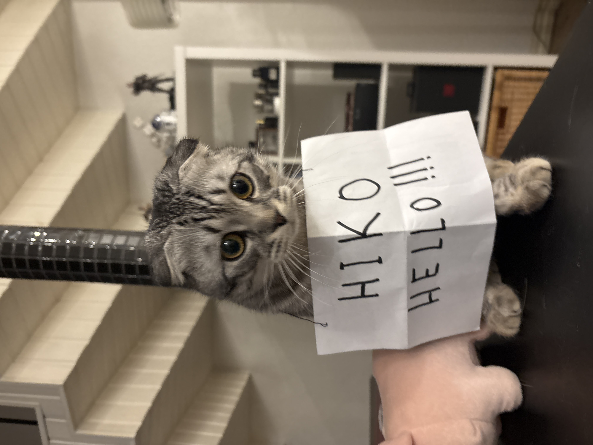 A gray tabby cat holds a piece of paper with the words "HIKO HELLO!!!" written on it in black marker