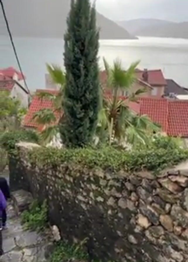 couple walking down a stone staircase in a town, likely near a body of water. The staircase is bordered by old stone walls, with some vegetation growing on them. Buildings with red-tiled roofs are visible. A tall, thin evergreen tree and a small palm tree are to the right of the stairs at the top. The couple is dressed in casual clothing, with one person wearing a purple hooded jacket. The weather appears to be overcast and rainy. The body of water, likely a bay or lake, is visible in the background, with mountains in the distance. A lamppost stands to the left.
