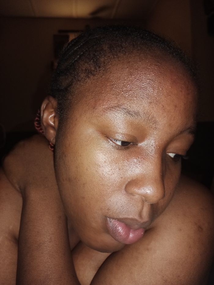 A close-up image taken indoors in Rafin Par, Nigeria, depicts an adult individual with dark skin, positioned with their head tilted downwards and slightly to the right