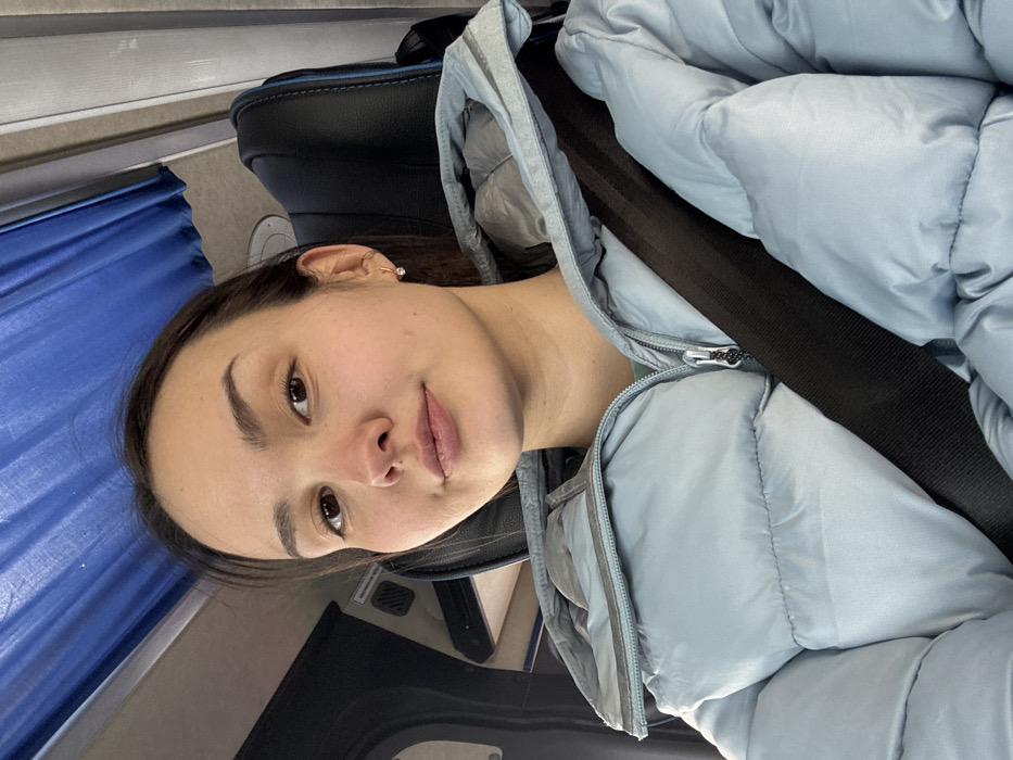 A young adult female is depicted in a close-up, chest-up view, seated within the interior of a passenger transport vehicle