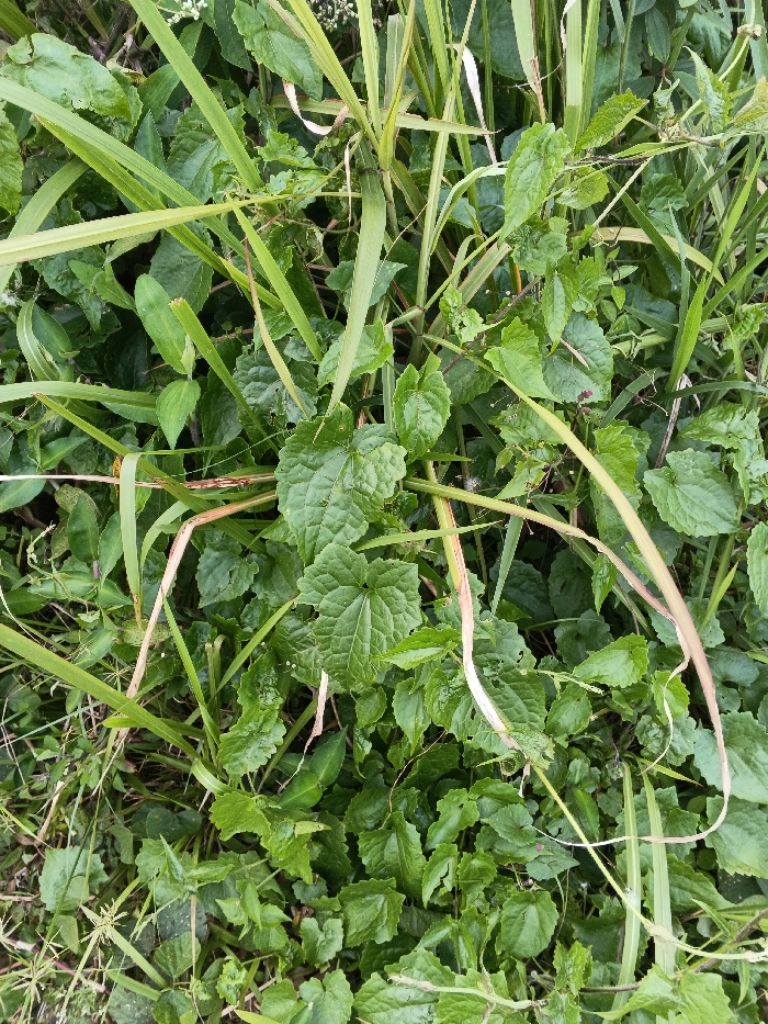 An overhead photograph captures a dense patch of mixed vegetation located in Chengdu, China. The scene is composed primarily of various shades of green foliage, dominated by broad-leafed plants displaying distinct venation and serrated or rounded margins, interspersed with numerous long, slender, grass-like blades. Some of the grass blades exhibit light brown or yellowish discoloration at their tips or edges, indicative of natural aging or minor desiccation. No human subjects, animals, or man-made objects are visible within the frame. The lighting suggests natural daylight conditions in an outdoor environment. No actions or interactions are depicted.