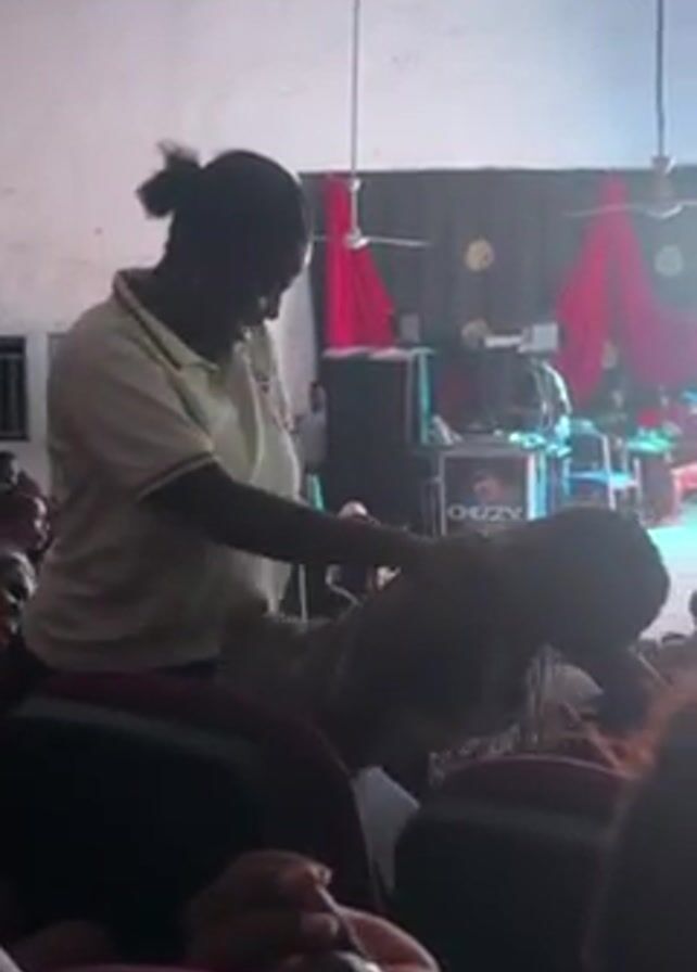 The video depicts two women inside a building that resembles a theater or church. The woman in the foreground, wearing a light-colored shirt and black pants, is standing behind another woman seated in a red chair. She appears to be massaging or touching the seated woman’s upper back and shoulders. The seated woman is leaning forward in her chair, seemingly in response to the touch. Around them, other people are seated in similar red chairs, with some visible in the background and to the sides. The building’s interior has red drapes hanging behind a stage area where some equipment and lights are visible. Ceiling fans are also present, and the overall lighting appears to be somewhat dim.