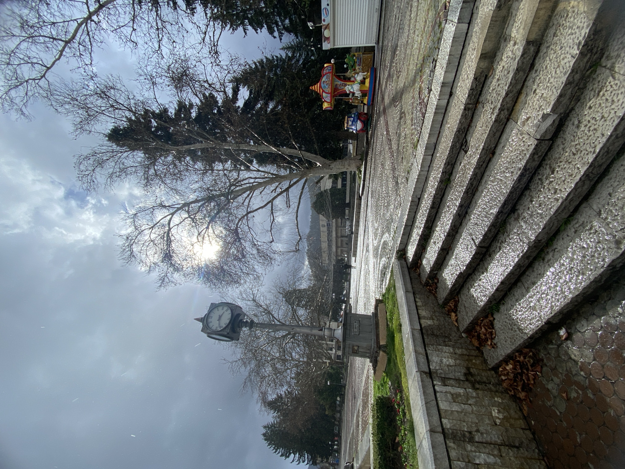 This image captures a public square or park area in the city of Troyan, Bulgaria, under a partly cloudy sky with sunlight breaking through. Light precipitation is visible as streaks in the air and on surfaces, which are uniformly wet and reflective. The time on the prominent clock tower reads approximately 12:45. In the foreground, a set of wet, rough-hewn light-grey stone stairs ascends from the lower-left corner. To the left of the stairs, a stone retaining wall is visible, with a collection of brown, dry leaves accumulated at its base. The ground at the bottom-left is paved with circular, reddish-brown cobblestones. The midground features a dark grey, four-faced public clock tower with Roman numerals, mounted on a stone pedestal, surrounded by a small patch of green grass and low green shrubs. To its right, a large deciduous tree with light-colored bark stands bare, alongside several other bare trees and dense evergreen trees, indicating a colder season. Further to the right, a colorful children's carousel ride with horses and other figures is present, next to a blue and red coin-operated children's ride resembling a cartoon car. A white vendor stall with roll-down shutters, appearing closed, is situated adjacent to these rides. The expansive paved area of the square is visibly wet and features a pattern of lighter-colored stones. In the background, behind the square and trees, several buildings are discernible. Beyond these structures, distant mountains or hills are visible beneath the cloudy sky. A single, indistinct individual can be seen walking across the wet pavement in the mid-background, moving towards the left.