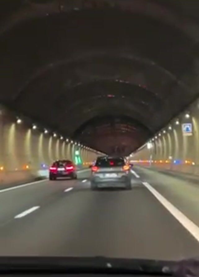 A car is driving through a tunnel. The tunnel is lit with evenly spaced lights along the walls. There are other cars in front of the camera's car, including a red car and a gray car. The road is marked with white lines. The tunnel's ceiling is arched.