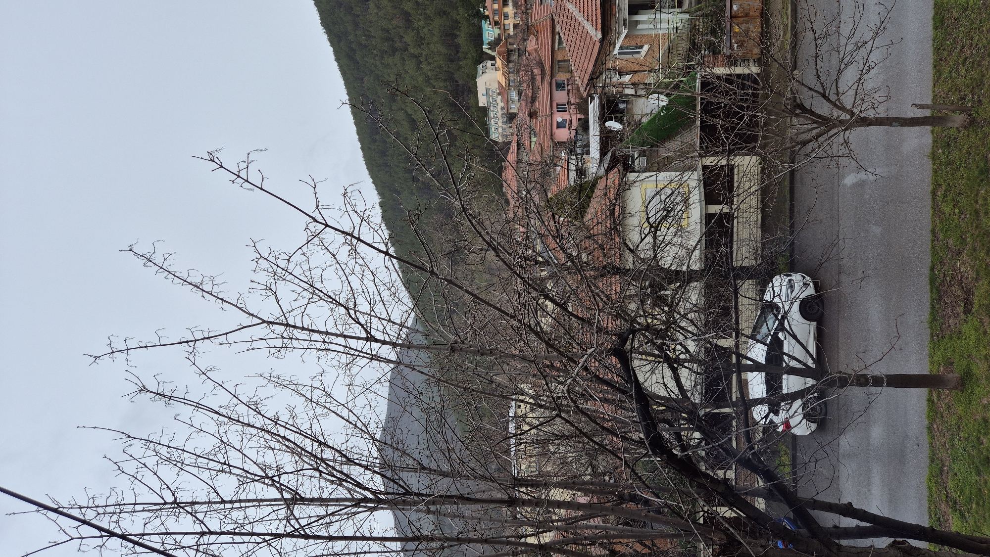 view from an elevated position, likely a balcony or window, overlooking a street in what appears to be Sliven, Bulgaria. In the foreground, bare branches of trees obscure part of the scene. Behind the trees, there is a street with a white car parked along the side. Beyond the street are buildings with red-tiled roofs, typical of the region. Further in the background, a forested hillside rises, creating a natural backdrop to the urban landscape. The sky is overcast, suggesting a cloudy day. There are no visible people or interactions in the scene. The environment consists of both natural and man-made elements, typical of a town nestled against a mountain.