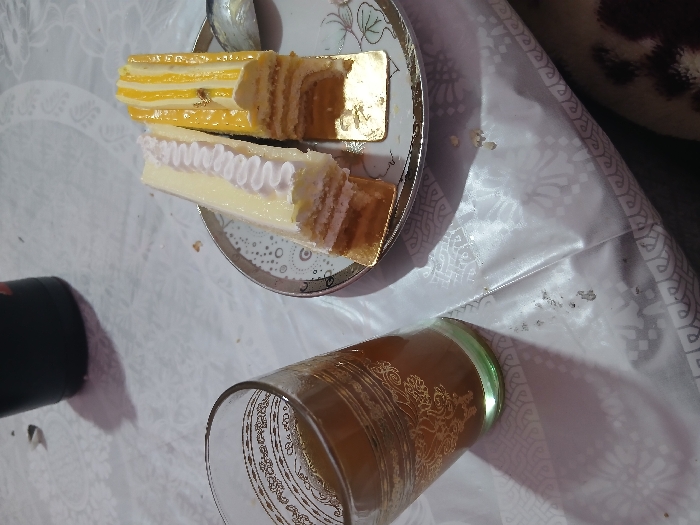 A slice of layered cake with white frosting sits on a decorative plate, next to another rectangular slice with yellow frosting and gold leaf. A glass etched with gold designs, filled with a brown beverage, rests near the plate on a white tablecloth with a repeating pattern. A dark, cylindrical object is also visible. The setting suggests a snack or tea time.