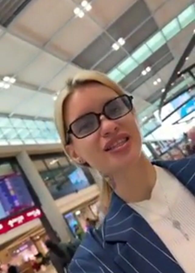 A blonde woman wearing a white t-shirt and a navy blue pinstripe blazer stands inside an airport. She has glasses on and has braces on her lower teeth. She is facing the camera while talking. She says that being at the airport makes her happy. Behind her, there are other travelers, shops, and flight display screens. The camera rotates slightly and shows stairs with an overhead sign that reads "Gates CD". There are people on the stairs and an escalator next to the stairs. The camera is tilted upwards. The ceiling is white with square panels.