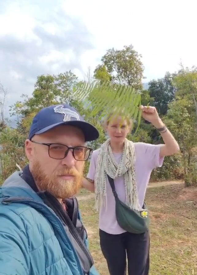 Here is a detailed description of the video: A selfie video shows a man and a woman outdoors in a natural environment. The man, who is closer to the camera, has a red beard and wears glasses, a blue cap, and a blue quilted jacket. He looks directly at the camera with a neutral expression. The woman stands slightly behind the man and to his right. She is holding a large fern leaf in her right hand, and she is moving it in a chopping motion with her arm extended. She has a scarf wrapped around her neck, a light purple shirt, and black pants. A small green bag hangs from her shoulder. The background consists of trees and a clear sky with scattered clouds. The ground appears to be a mix of dirt and grass. The camera remains steady, suggesting it is handheld. The focus seems to be on the man, while the woman's actions are more in the background.