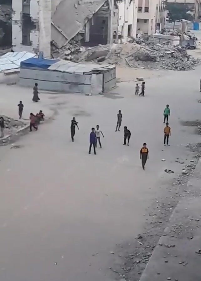 group of about a dozen children playing in a rubble-strewn, open area. The area is surrounded by buildings, some of which are heavily damaged, with exposed interiors and collapsed walls. Debris is scattered throughout the area. The sky appears overcast, suggesting it might be a grey or gloomy day. Some adults can be seen walking in the background. The children are spread across the open space, engaged in what appears to be a casual game, kicking or throwing something. The general environment suggests an urban area that has experienced significant destruction, likely from conflict or a natural disaster.
