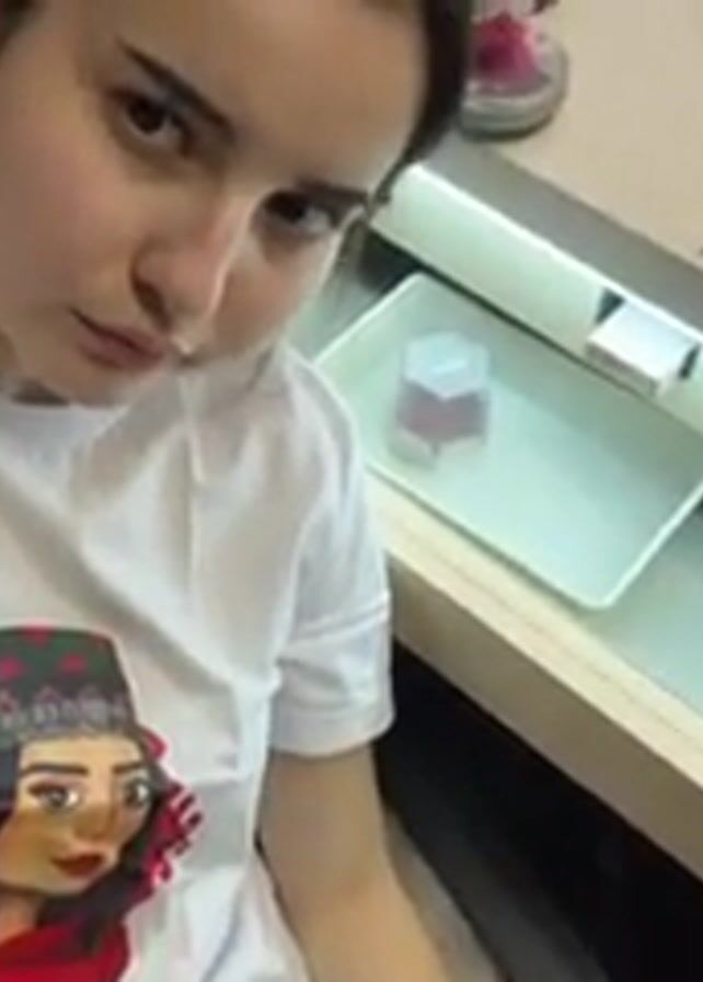 A young woman takes a selfie in what appears to be a dental lab. She has dark hair and is wearing a white t-shirt with a graphic of a woman in a traditional headscarf on it. The woman in the selfie makes a kissy face, and then holds up her hand, flashing the "rock on" sign. Behind her is a brightly lit workstation with various dental molds, instruments, and a tray of red powder. A shelf above the workstation holds more dental molds and supplies.