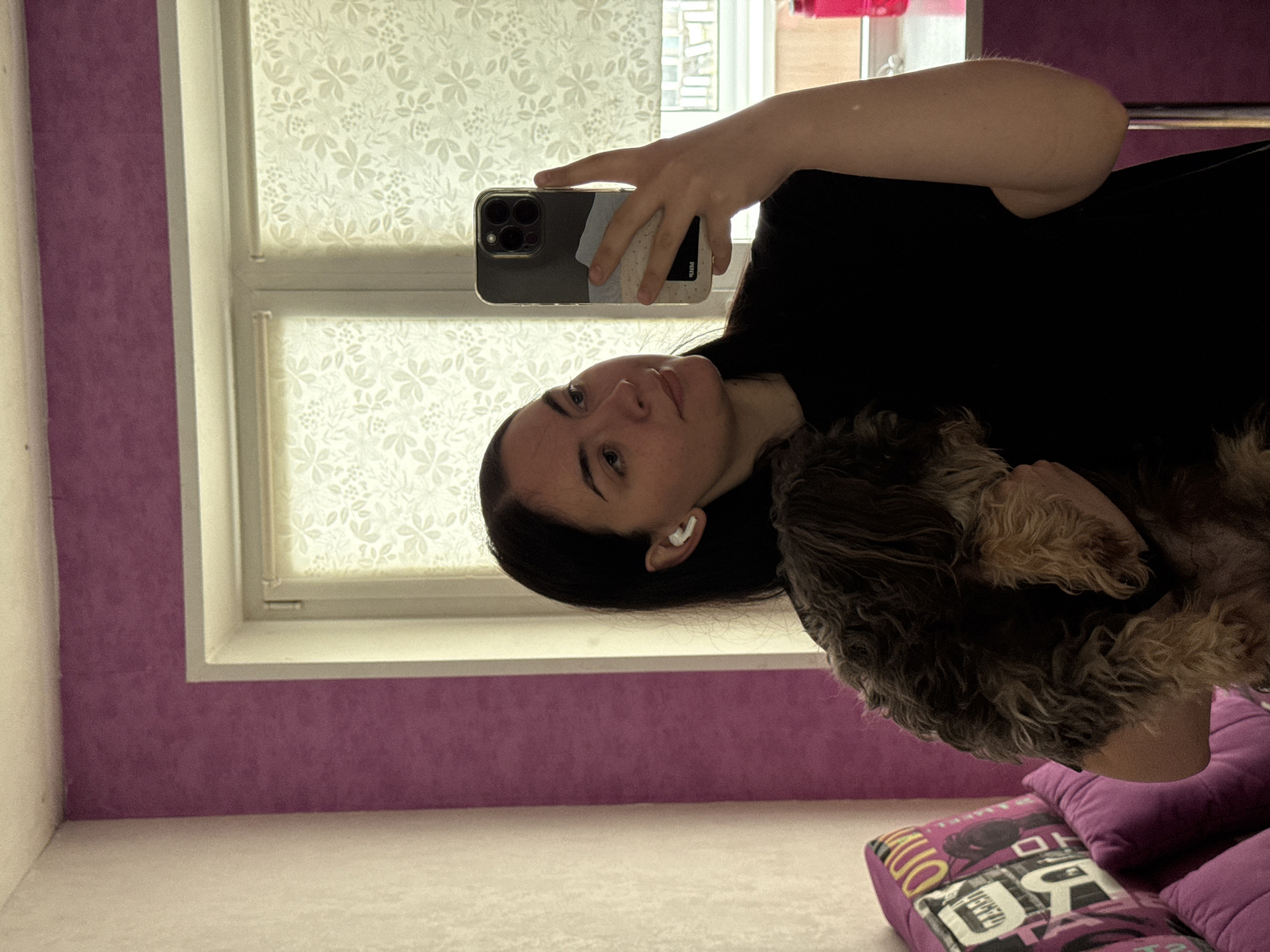 A young woman takes a selfie with her dog in a room with purple walls and a white window. The room seems to be located in Chaikovsky, Russia, based on the building visible through the window. The woman is wearing a black shirt and has dark hair, and is holding a phone with a patterned case. The dog is a small, fluffy breed with brown and gray fur. The environment includes a window with patterned window film and a decorative pillow with letters on it.