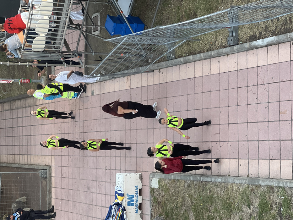 This image captures an outdoor event preparation scene in Playa Del Inglés, Spain. The primary area is a light-colored paved walkway with square tiles. **People:** * Seven individuals, primarily young females, are visible wearing identical performance attire: black full-length leggings, neon yellow-green sleeveless crop tops with black geometric patterns, and matching wristbands. Four are positioned further back, with three closer to the foreground. One young female, also in black leggings, wears a red long-sleeved top and walks alongside two of the performers. * One adult female with long reddish-brown hair, wearing a brown top and black pants, walks alongside the performers. * On the far left, a police officer in a dark blue uniform stands beside a metal fence. * To the right, near a scaffolding structure, are several adult individuals. These include: * Two men in high-visibility yellow-green vests, one with a white undershirt. * One man in a blue and white uniform. * One woman in white scrubs, carrying a black shoulder bag. * On the multi-level metal scaffolding structure, several people are present: one person in a red long-sleeved top and another in a grey top are standing, and others are seated on white chairs. **Objects and Environment:** * A large concrete block marked "MASPALOMAS" with folded blue and yellow fabric on top is located on the left side of the walkway. * A low-cut grass area borders the walkway on the left. * A temporary metal barrier fence runs along the entire right side of the walkway, separating it from the scaffolding and another ground area. * The scaffolding structure is multi-tiered, constructed from metal, and features white plastic chairs. * Behind the metal barrier, two blue plastic containers are stacked on the ground. * In the background, a street or service road is visible with a red fire hydrant. * The lighting suggests daytime conditions.