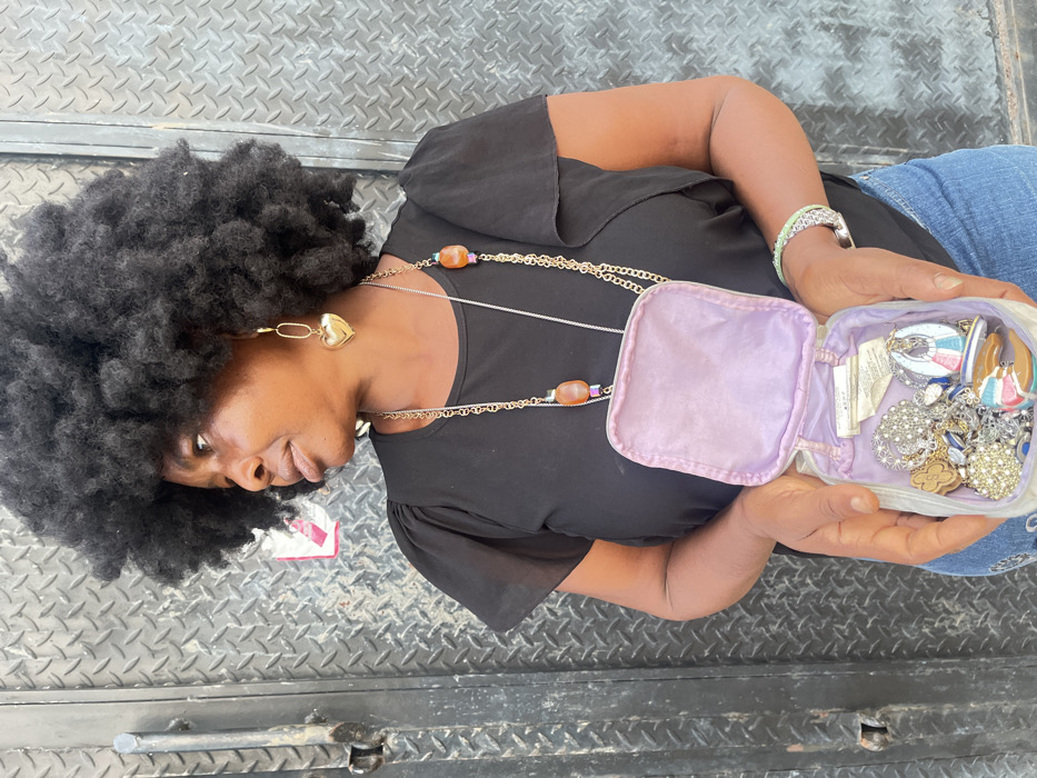 In the city of Iranla, Nigeria, a woman is depicted from the waist up, facing slightly left of the viewer, with her gaze directed towards her right. She possesses dark skin and a voluminous, dark afro hairstyle. Her attire includes a black short-sleeved top with ruched detailing on the sleeves and partially visible blue jeans. A gold-colored heart-shaped drop earring is present on her visible right ear. She wears two necklaces: one a lengthy gold-colored chain, and another, a silver-colored chain adorned with two large, oblong, reddish-brown beads. A light green and silver-colored bracelet or watch is on her left wrist. Both of her hands are engaged in holding an open, light purple, rectangular pouch at waist level. The pouch contains a heterogeneous collection of jewelry, including multiple brooches and pins of various designs, some featuring clear stones, others enamel, and one resembling a stylized figure. A small white tag is visible within the pouch. The background consists of a dark, metallic surface exhibiting a raised diamond-plate pattern, indicative of a wall or door. A vertical metal bar or handle is visible on the left side of the background, and a small, torn piece of red and white paper is affixed to the metallic surface behind the woman's head.