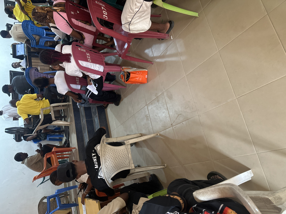 An indoor facility in Iriebe, Nigeria, displays a group of approximately 15-20 individuals in what appears to be a training or computer lab setting