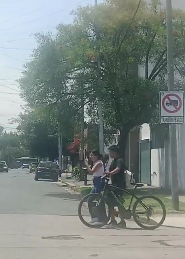 man and a woman walking across a street with a bicycle. The woman raises her arm, appearing to point something towards the left side of the frame. The street has cars parked along its sides and other cars are driving on the road. Trees line the sidewalks and there are utility poles with overhead wires. A sign indicates "Transito Pesado," a Spanish phrase meaning "Heavy Traffic." It's a sunny day.