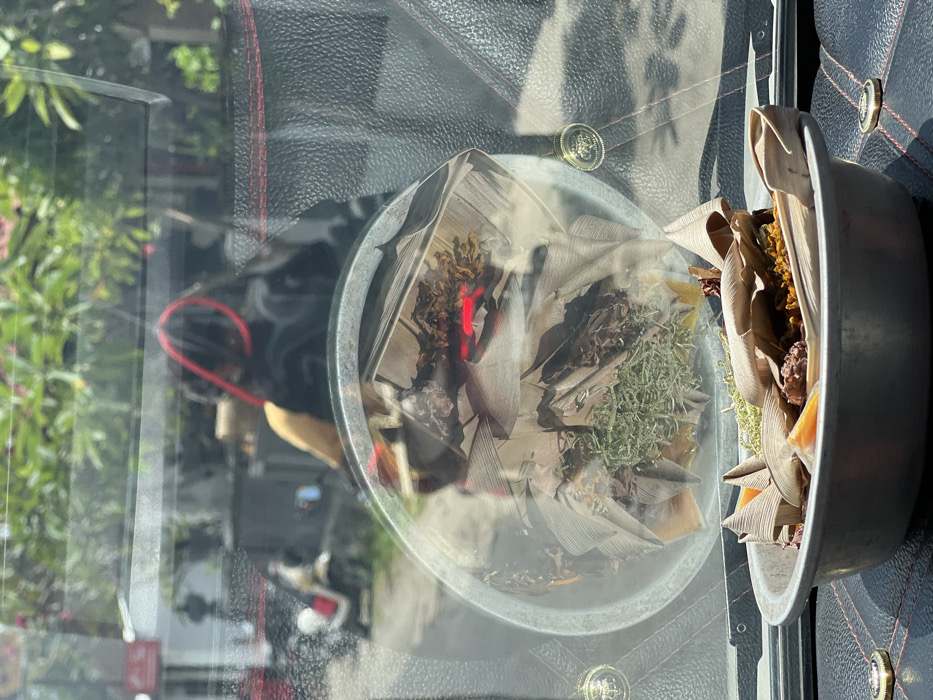 A low-angle shot inside a car shows a round, clear container holding an assortment of dried leaves, moss, and twigs