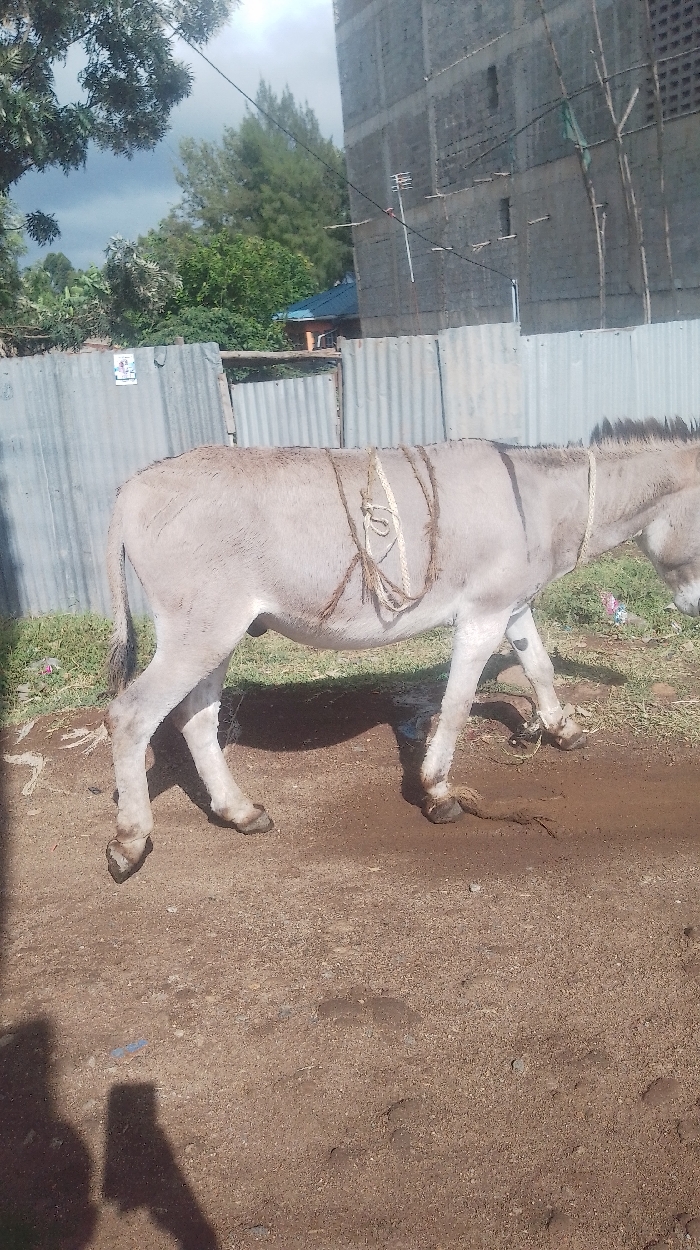 - "A light gray donkey stands on dirt ground, secured by rope around its neck and torso" by FM-6I99q1, licensed under CC BY 4.0