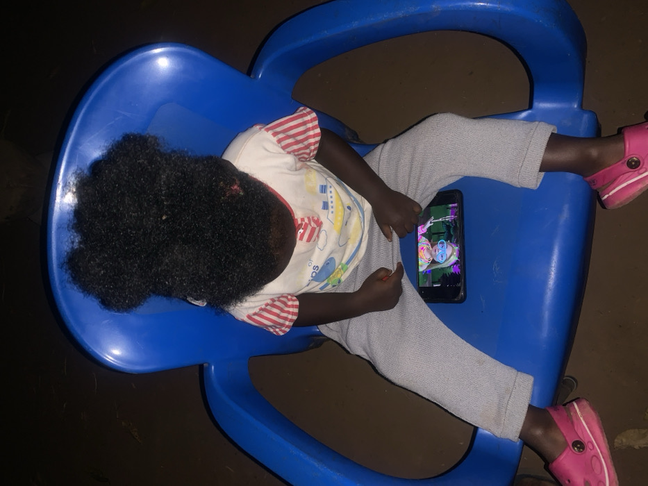 A child is seated in a blue plastic chair, engrossed in a mobile phone game or video