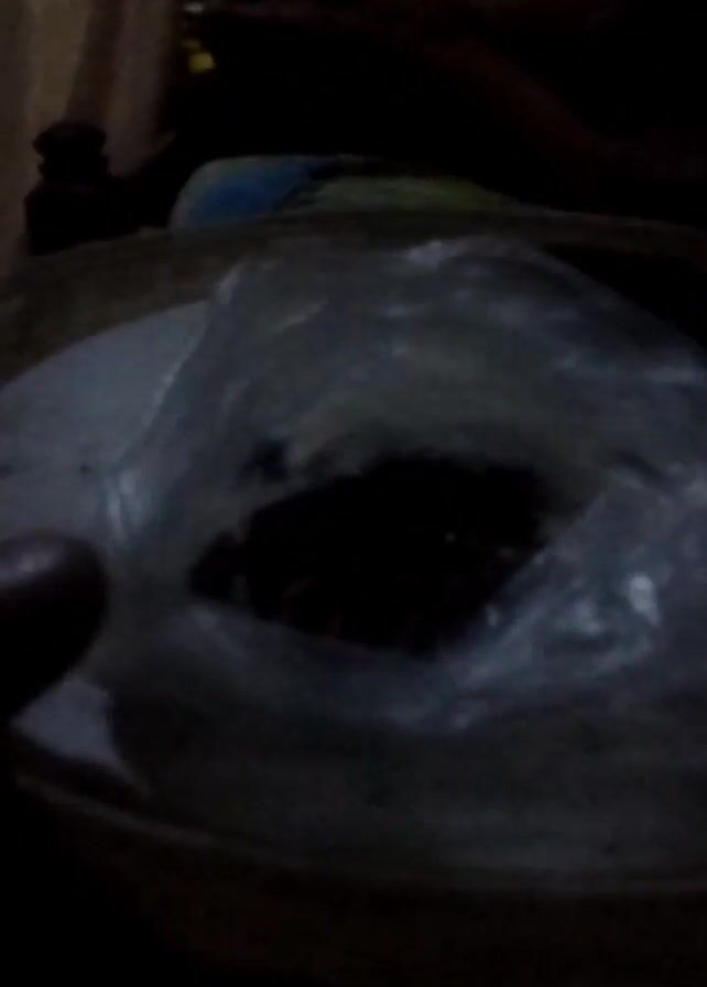In a dimly lit room, a dark object, possibly food, sits in a plastic bag within a larger bowl or container. The bag has a central opening, revealing the contents. A finger is visible at the lower left edge of the screen. The room is generally dark, with limited details visible in the background, including what appears to be a bed with a pillow.