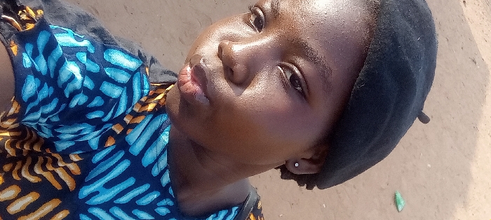A young, dark-skinned woman with full lips and a small earring poses in a close-up shot. She wears a black hat and a colorful top with blue, black, and yellow patterns. Her gaze is directed slightly upward. The background is a mix of light brown and sandy ground, suggesting an outdoor setting. The image is well-lit, highlighting her features and clothing details.
