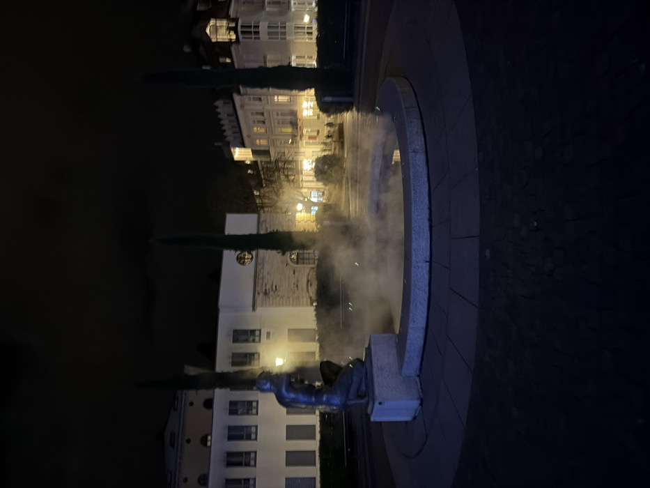 At night, a circular stone fountain stands with a statue of a person sitting on its edge. Mist or steam rises from the fountain's center. Illuminated buildings with multiple windows are visible in the background. Dark trees frame the scene vertically. The foreground and remaining background are black, suggesting darkness.