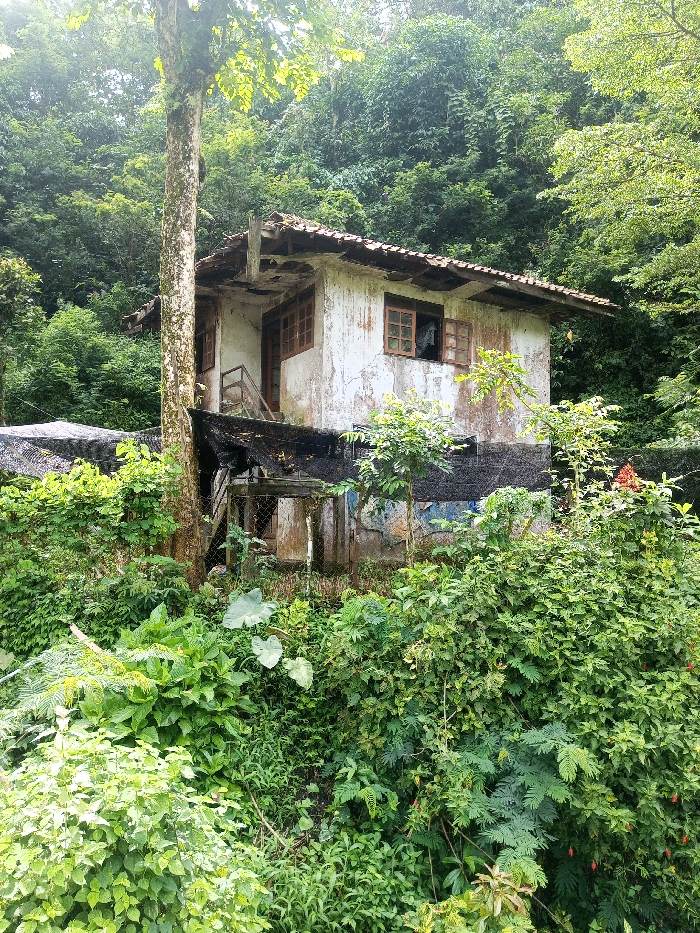 A weathered, white, one-story building with a tiled roof sits nestled amongst dense green foliage. Windows with brown frames are visible, and a makeshift staircase leads to the entrance. The structure's facade shows signs of decay, with peeling paint and visible wear. Black netting surrounds a portion of the base. Lush greenery surrounds the building, creating a sense of nature reclaiming the space. A tall tree stands alongside the building, further integrating it into the landscape.