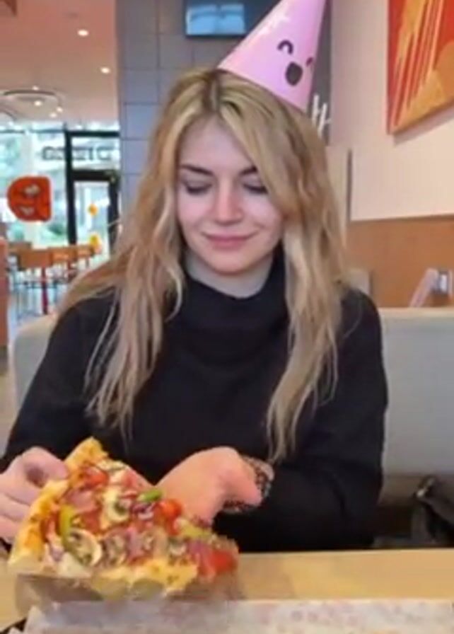 A blonde woman wearing a black turtleneck sweater and a pink party hat is sitting at a table in a restaurant. She is eating a slice of pizza with various toppings, including tomatoes, green peppers, and mushrooms. Other slices of pizza are visible on the table. The restaurant appears to be modern and brightly lit.