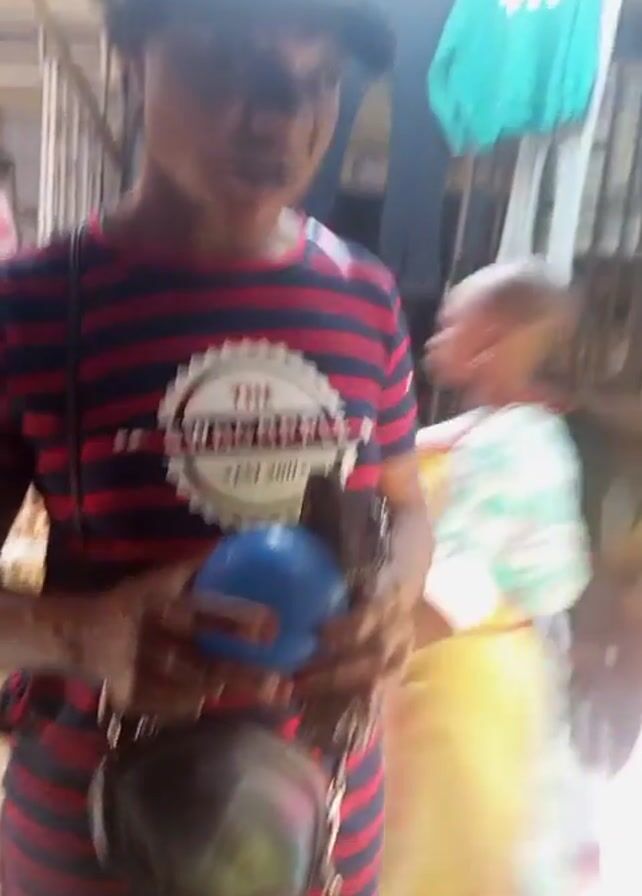 In an outdoor setting, a woman stands in front of a cluttered stall. She is wearing a baseball cap, a striped t-shirt with the word "THE SWAGAPPLE EST 2011" on it, and a small purse hanging from her shoulder. She is holding a blue soccer ball in her hands. The stall behind her is filled with various items, including clothes hanging on racks and piles of fabrics. The overall environment appears to be a busy market or street vendor setting.