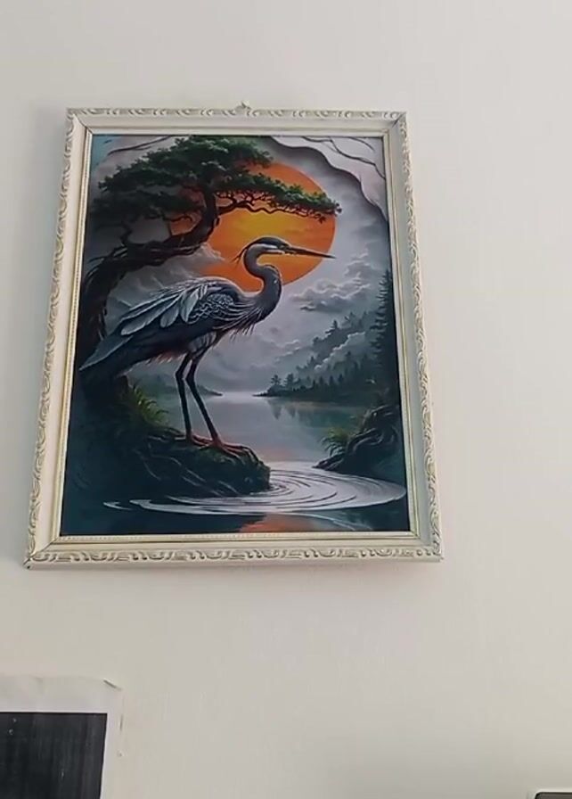 framed picture hanging on a white wall. The picture depicts a heron standing on a rock near a body of water. A tree is visible to the heron's left, and the sun is setting in the background. The frame is white with a decorative pattern. A dark-colored object is partially visible below the picture.