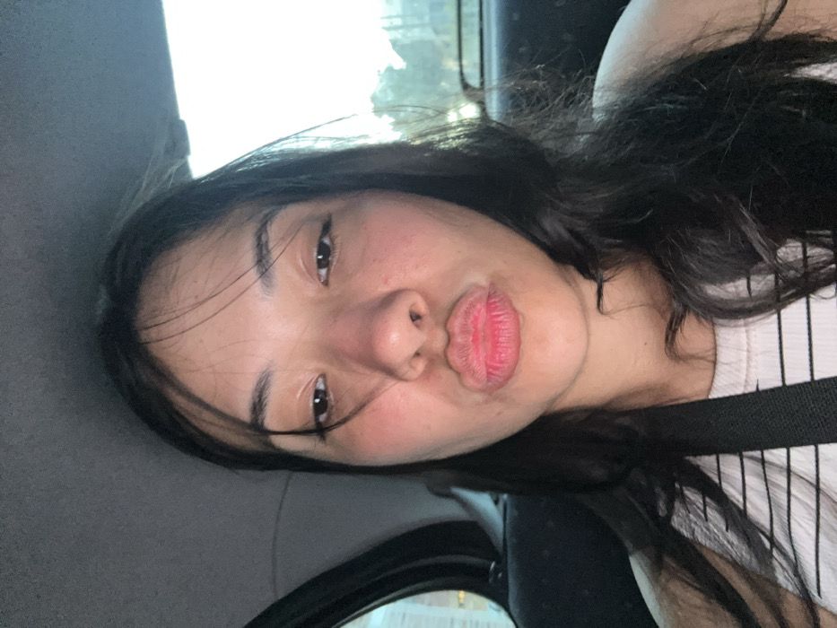 The image portrays a female individual seated within the interior of a vehicle in Villa Yapeyú, Argentina. Her long, dark hair cascades around her shoulders. She has a fair to medium complexion, with her dark eyes fixed on the camera. Her lips are pursed into a distinct 'kissing' expression, highlighted by a red color. She is attired in a light-colored top with horizontal stripes, and a black seatbelt diagonally crosses her chest. The vehicle's grey headliner is visible above. Through the vehicle's windows, the external environment is blurred, showing indistinct structures or light on the left and a lighter, possibly outdoor scene with foliage or sky on the right, consistent with ambient daylight.