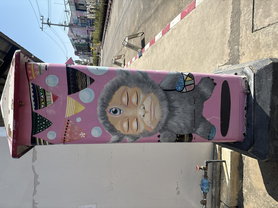 A pink mailbox, adorned with whimsical art, stands outdoors. The artwork includes colorful triangular pennants and a grey furry creature with four eyes, one open. The creature wears a patterned shoulder bag and wristband. The mailbox is mounted on a dark post. The background features a street scene with buildings and sidewalks, with a red-and-white striped curb. A water meter is visible nearby on the wall.