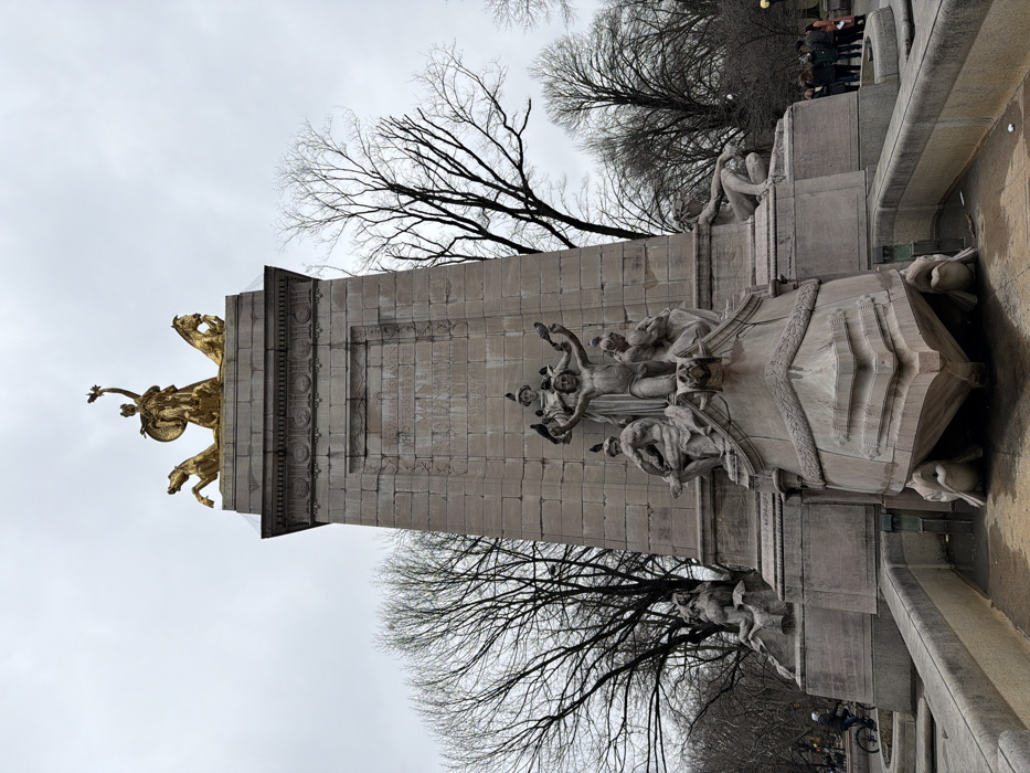 The image displays the USS Maine National Monument, located at the Columbus Circle entrance to Central Park, in New York City, United States of America. The monument, rendered in stone and gilded bronze, occupies the central frame under an overcast gray sky. The monument's base features a large, light-colored stone boat-like prow, supported by sculpted turtle figures, emerging from a shallow water basin. Above this, a tall stone pedestal rises. The mid-section of the pedestal incorporates several classical-style stone sculptures: a central standing figure with raised arms is surrounded by multiple seated and reclining figures. Several dark-feathered pigeons are perched on these stone sculptures. Inscribed or decorative relief panels are visible on the flat surfaces of the pedestal. Crowning the pedestal is a prominent gilded bronze sculpture. This upper group features a central standing female allegorical figure, holding an object (appearing as a torch or wreath) aloft in her right hand and a shield in her left. She is flanked by two rearing horses, positioned symmetrically. The surrounding environment includes numerous bare deciduous trees, indicative of a winter or early spring season. On the left side of the frame, a paved pathway is visible, with one individual riding a bicycle away from the monument. On the right, a group of approximately five to seven individuals stands near the base of the monument, partially obscured by the structure. The ground immediately around the monument appears to be paved.