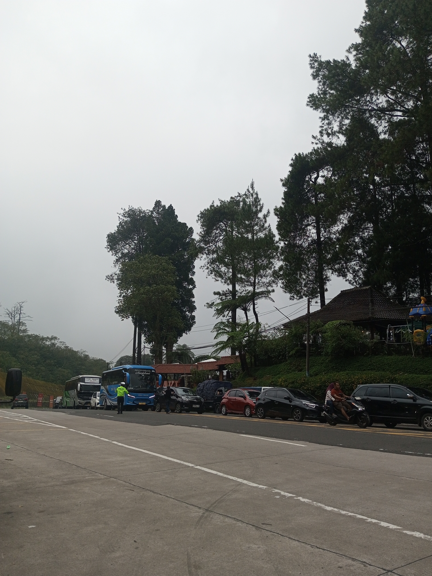 The image depicts a roadside scene on a cloudy day. A row of parked vehicles, including buses and cars, lines the side of the road. A traffic officer in a bright green vest stands near one of the buses. A motorcyclist with a passenger drives along the road next to the parked cars. Behind the vehicles, there is a grassy embankment with trees and a building with a traditional-style roof. The environment suggests a location outside of a dense urban area, likely in a rural or suburban setting. The location is in Mae Chan District, Thailand.