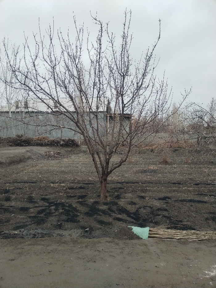 This image depicts an outdoor scene in Ялтир, Uzbekistan, under an overcast grey sky. A central, leafless deciduous tree with a brown trunk and numerous bare branches dominates the midground. The ground directly beneath and around the tree shows dark, disturbed earth arranged in patterned rows or mounds, indicating recent cultivation. To the right of the central tree, a light green tarp covers a bundle of long, thin, light-colored wooden stakes or branches lying horizontally on the ground. The immediate foreground consists of a grey-brown dirt or muddy path. In the background, a low, light grey building or wall structure runs horizontally across the left-middle of the frame. Behind this structure, several piles of dried branches or brush are visible. Further to the right in the background, more bare trees and shrubs are present, blending into the muted, dry landscape. No individuals are visible, and no active interactions or discernible actions are depicted.