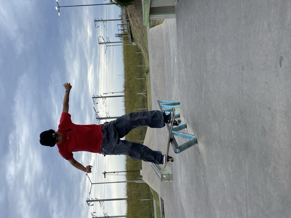 A person in a red shirt, dark pants, and a black beanie is skateboarding. The skateboard is positioned on a blue metal structure in a skate park. The person has one arm raised in the air. In the background, there is a grassy area, power lines, a street lamp and a partly cloudy sky. The image appears to be rotated ninety degrees clockwise.