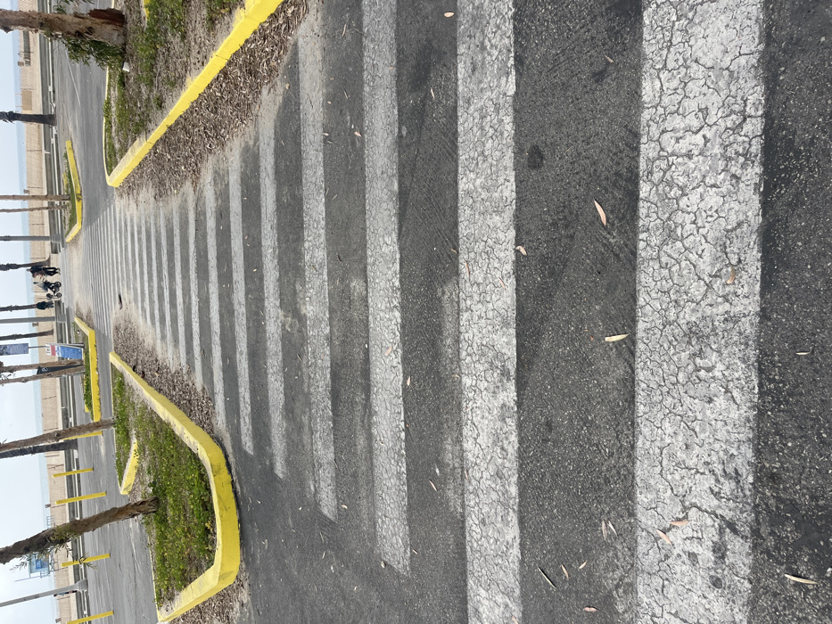 A downward angle shot showcases a crosswalk with broad white stripes alternating with asphalt. Yellow curbing defines the path. Patches of greenery and trees flank the sides, leading to a distant beach scene. A small group of people is walking across the crosswalk in the distance. The white paint on the crosswalk has a worn, cracked texture. A few scattered leaves lie on the pavement.